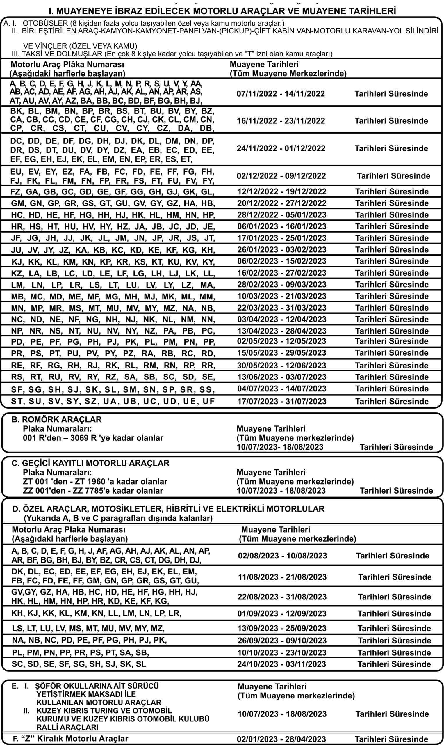 2022 – 2023 Yılı Motorlu Araçlar Muayene tarihleri:
