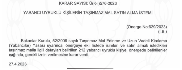 Bakanlar Kurulu’nun almış olduğu kararla 212 yabancı uyruklu kişiye taşınmaz mal satın alma izni verildi.