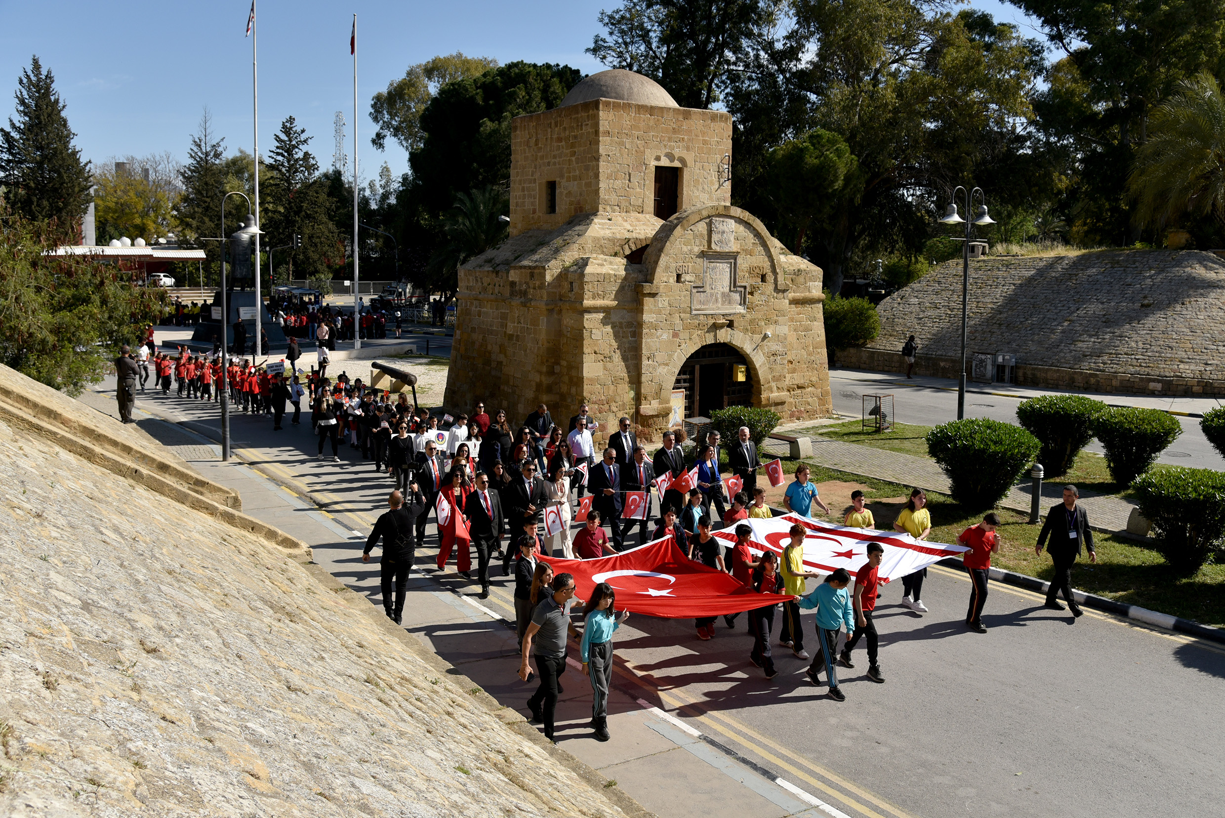Lefkoşa Merkez okullarından gelecek öğrenci ve sorumlu öğretmenler , Milli Eğitim Bakanı Nazım Çavuşoğlu ile birlikte önce Atatürk Büstü’ne çelenk koydu. Daha sonra Kortej Cumhurbaşkanlığı’na yürüdü ve burada Cumhurbaşkanı Ersin Tatar çocuklara hitaben bir konuşma yaptı.