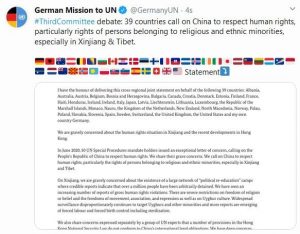 Almanya’nın BM Daimi Temsilcisi Christoph Heusgen, BM Genel Kurulu’nda 39 ülke adına yaptığı ortak açıklamada, ”Uygur kültürünün yanı sıra inanç, ifade ve hareket özgürlüğü üzerinde ciddi kısıtlamalar var. Uygurlar ve diğer azınlıklar orantısız bir şekilde gözetleniyor. Zorla çalıştırma ve kısırlaştırma dahil zorla doğum kontrolü yöntemleri uygulandığı iddiaları ortada.” dedi.
