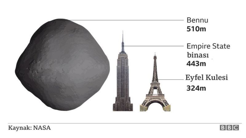 Bennu 500 metre büyüklüğünde bir asteroit. Buradan parçalar getirme arayışı 2016’da NASA’nın Osiris-Rex sondasını fırlatmasıyla başladı. Cisme ulaşmak iki yıl sürdü. Görev ekibinin asteroit yüzeyinden “toprak” örneği almak için güvenli bir yer belirleyebilmesi için de iki yıl daha haritalama yapılması gerekti.