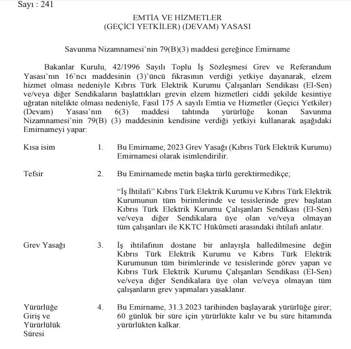 Bakanlar Kurulu, elzem hizmetleri ciddi şekilde kesintiye uğratacağı gerekçesiyle El-Sen’in Kıbrıs Türk Elektrik Kurumu’ndaki grevini 60 gün süreyle yasakladı.