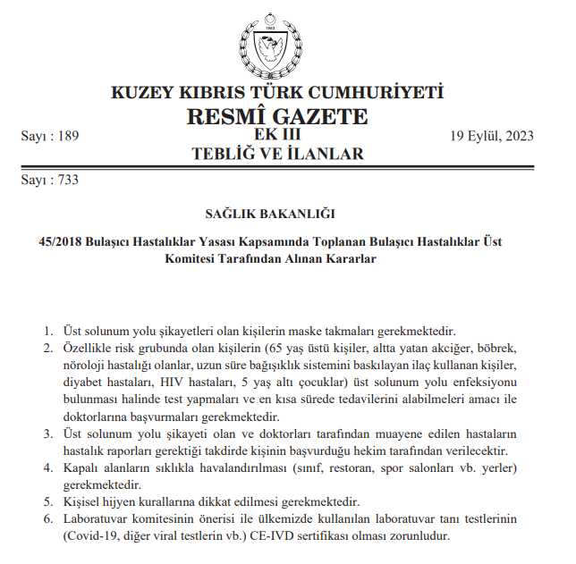 Bulaşıcı Hastalıklar Üst Komitesi’nin aldığı yeni kararlar Resmi Gazete’de paylaşıldı. Komite, üst solunu yolu rahatsızlığı olan kişileri maske takmaları yönünde uyarıda bulundu.