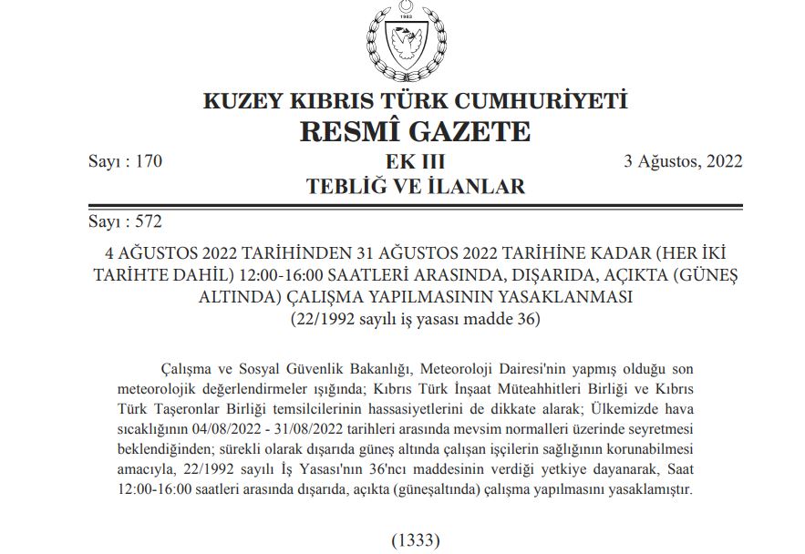 Çalışma ve Sosyal Güvenlik Bakanlığı, yarından itibaren ay sonuna kadarki sürede, 12:00-16:00 saatleri arasında açıkta, güneş altında çalışılmasını yasakladı. Mevsim normalleri üzerinde seyreden hava sıcaklığı dikkate alınarak üretilen yasaklama kararı, Resmi Gazete’de yayımlandı.