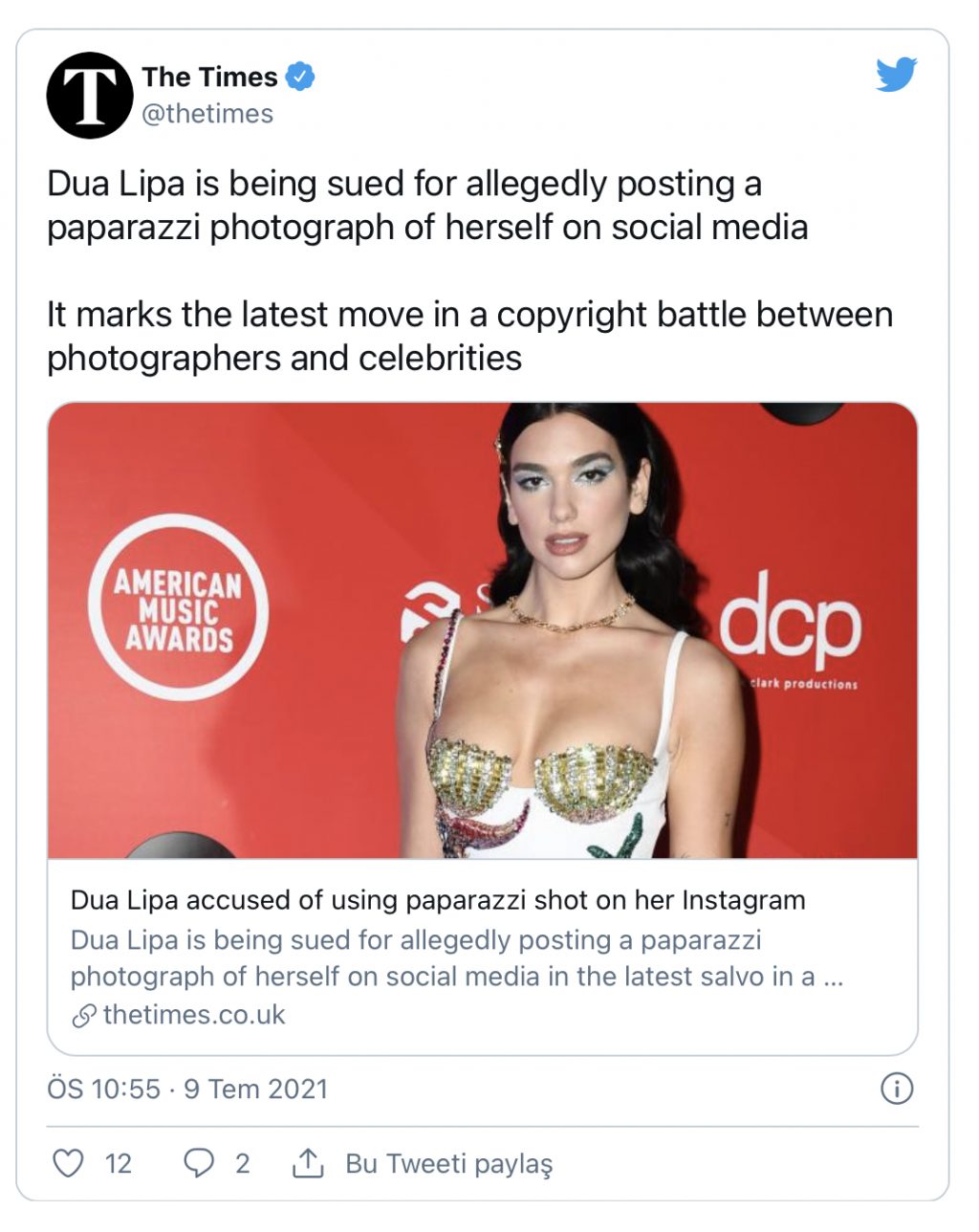Şarkıcı Dua Lipa paparazzilerin kendisini çektiği fotoğrafı Instagram’da paylaştığı için davalık oldu. 25 yaşındaki şarkıcının 150 bin dolar telif ödemisi gündemde.