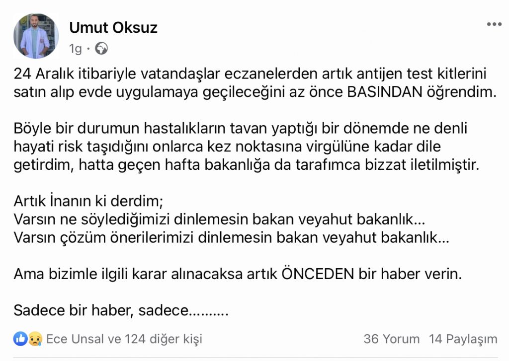 Hükümet, 24 Aralık tarihinden itibaren vatandaşların eczanelerden antijen test kitlerini satın alıp evde uygulayabileceğini duyurdu ancak eczacıları bilgilendirmeyi unuttu. Eczacılar Birliği Başkanı Umut Öksüz, kararı basından öğrendiğini açıkladı.