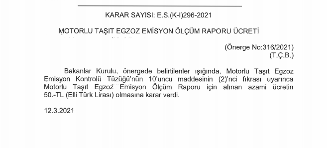 Bakanlar Kurulu, motorlu taşıtların egzoz emisyon ölçümlerinden alınacak ücretin en fazla 50 TL olmasına karar verdi.