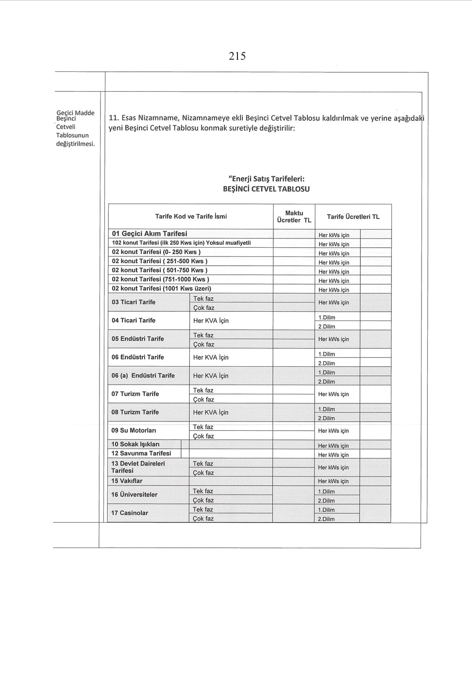 Bakanlar Kurulu sessiz sedasız Yeni Elektrik İnkişaf Nizamnamesini onaylayarak Resmi Gazetede yayınladı. Yeni Nizamname ile Çoklu Tarife Sistemi yürürlükten kaldırılarak, Eski Tarife Sistemine dönüş yapıldı. Üstelik yayınlanan Nizamname aklımızla alay edercesine BOŞ bir TABLO ile paylaşıldı.