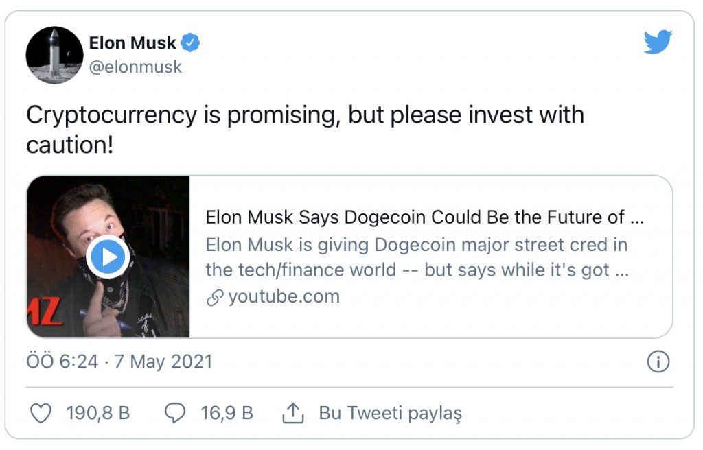 Elon Musk, Twitter üzerinden paylaştığı bir gönderide, “Kripto paralar umut vadediyor ama lütfen dikkatli yatırım yapın” dedi.