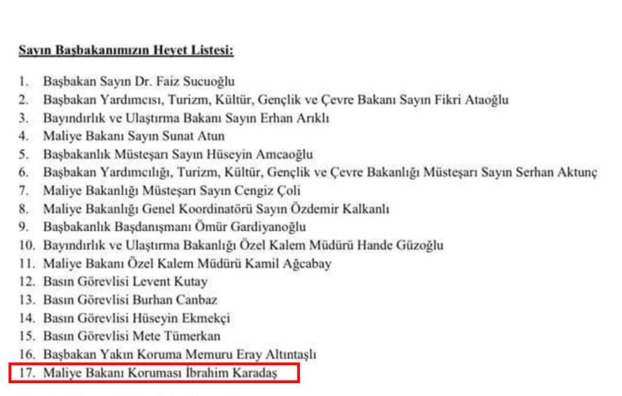 Ankara’ya dün mâli protokol için giden KKTC Başbakanlık resmi heyetinin 17. sırasında ticari sicili “berberlik” olan İbrahim Karadaş’ın resmi polismiş gibi Sunat Atun’un “koruması” olarak yazılarak Başbakanın heyetinde yer alması dikkat çekti.