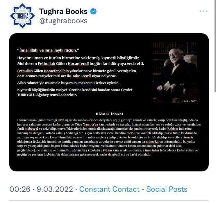 İddia, New Jersey’de bulunan Tughra Books isimli kitap yayıncısının sosyal medya hesabından paylaşılan taziye mesajında yer aldı.