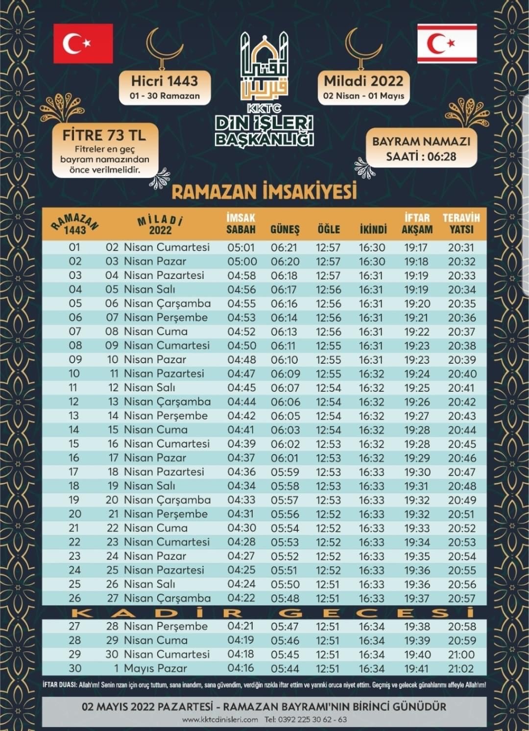 Yarın başlayacak olan oruç, 1 Mayıs Pazar günü son bulacak. İlk imsak 05.01’de, ilk iftar ise 19:17’de yapılacak.