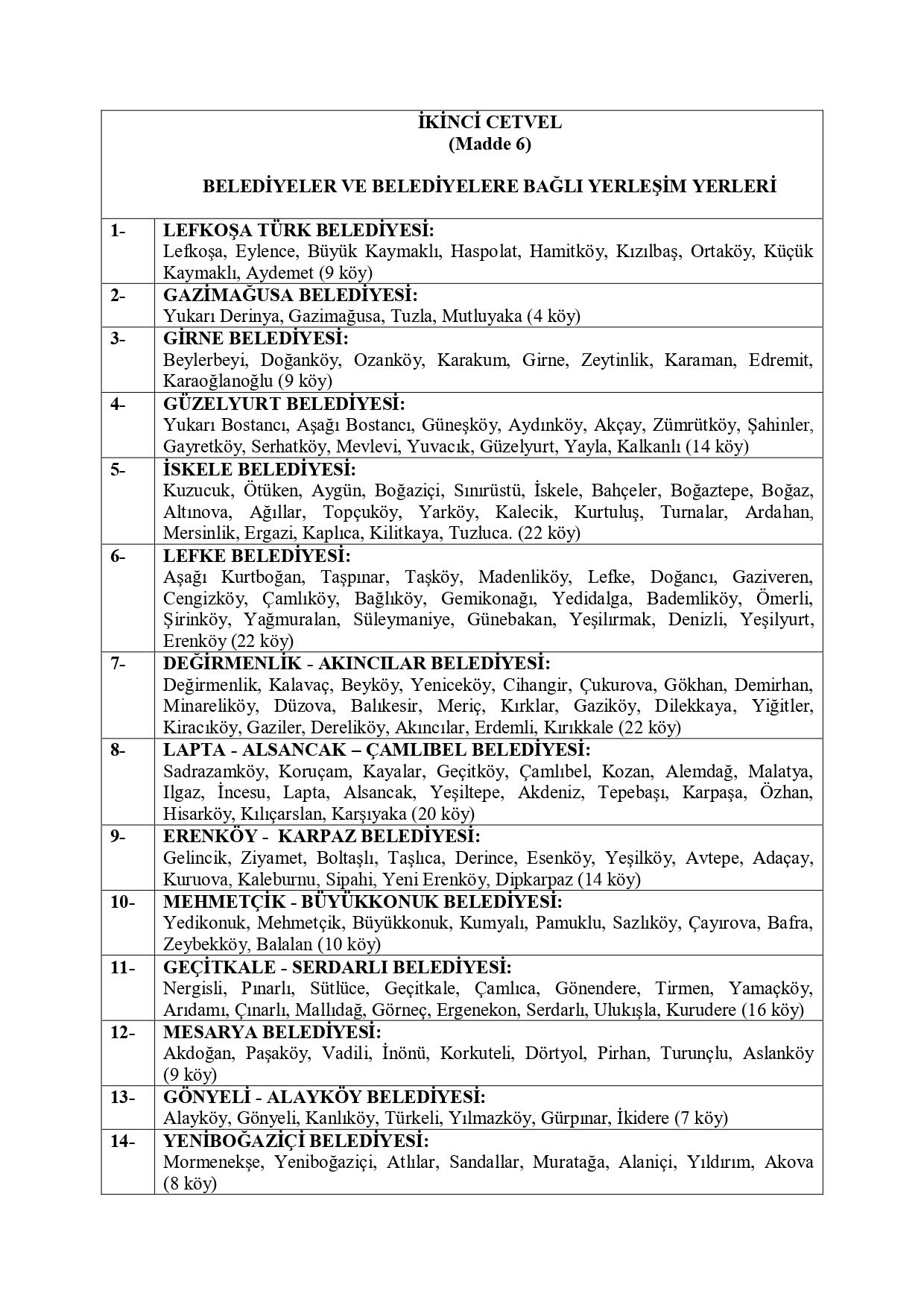 Cumhuriyet Meclisi’nin resmi internet sitesinde, yasa tasarısının tüm detayları paylaşıldı. Buna göre, belediyeler ve belediyelere bağlı yerleşim yerleri şöyle sıralandı: