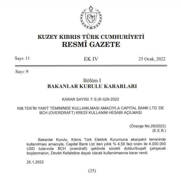Bakanlar Kurulu aldığı karar ile Kıb-Tek’in akaryakıt temini için 4 Milyon Dolar borçlandırılmasına karar verdi.