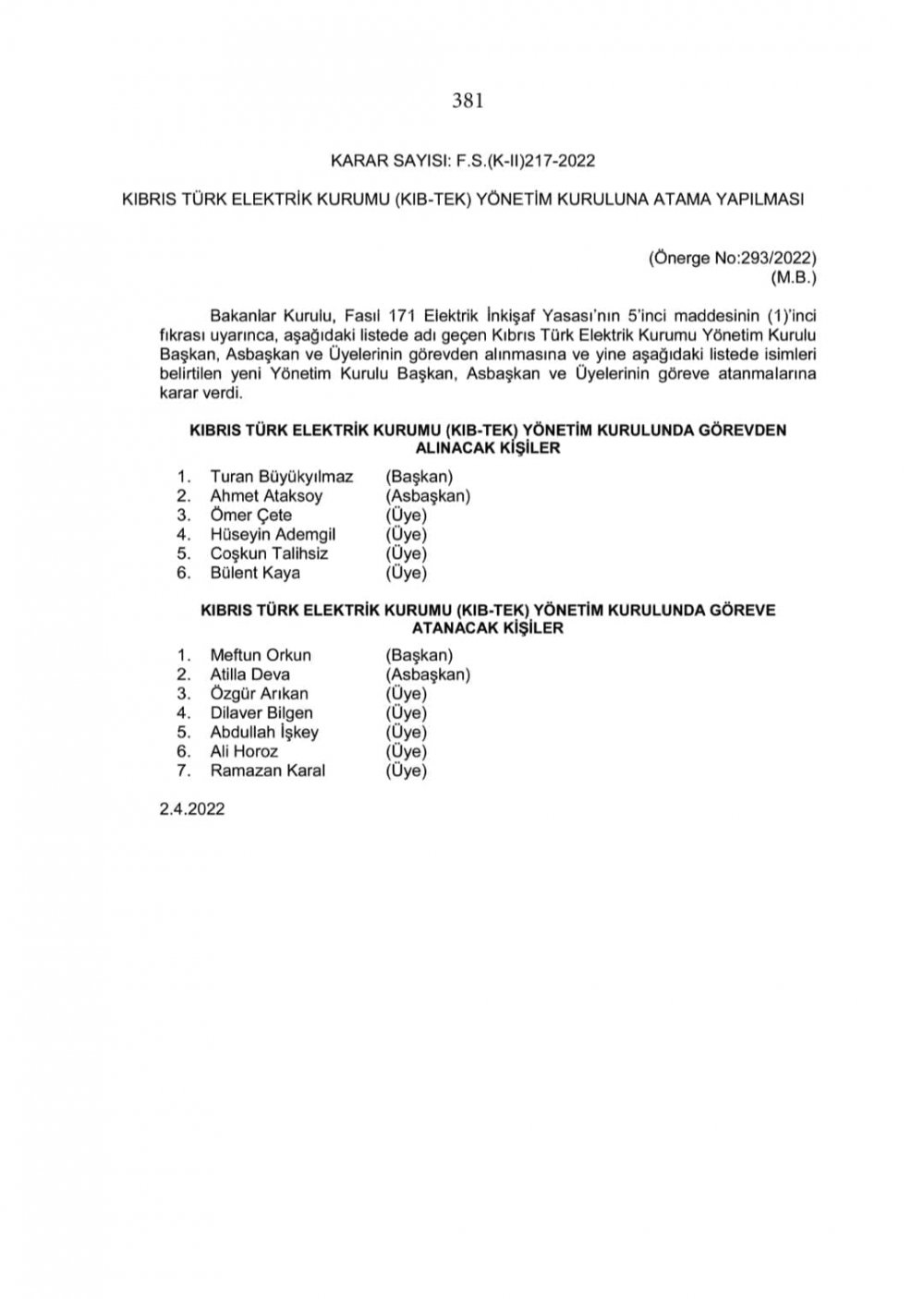 Resmi Gazete’de yayınlanan atama kararıyla, Meftun Orkun’un Yönetim Kurulu Başkanlığı’ndaki yeni yönetim kurulu, Atilla Deva (asbaşkan), Özgür Arıkan, Dilaver Bilgen, Abdullah İşkey, Ali Horoz ve Ramazan Kartal’dan oluşuyor.
