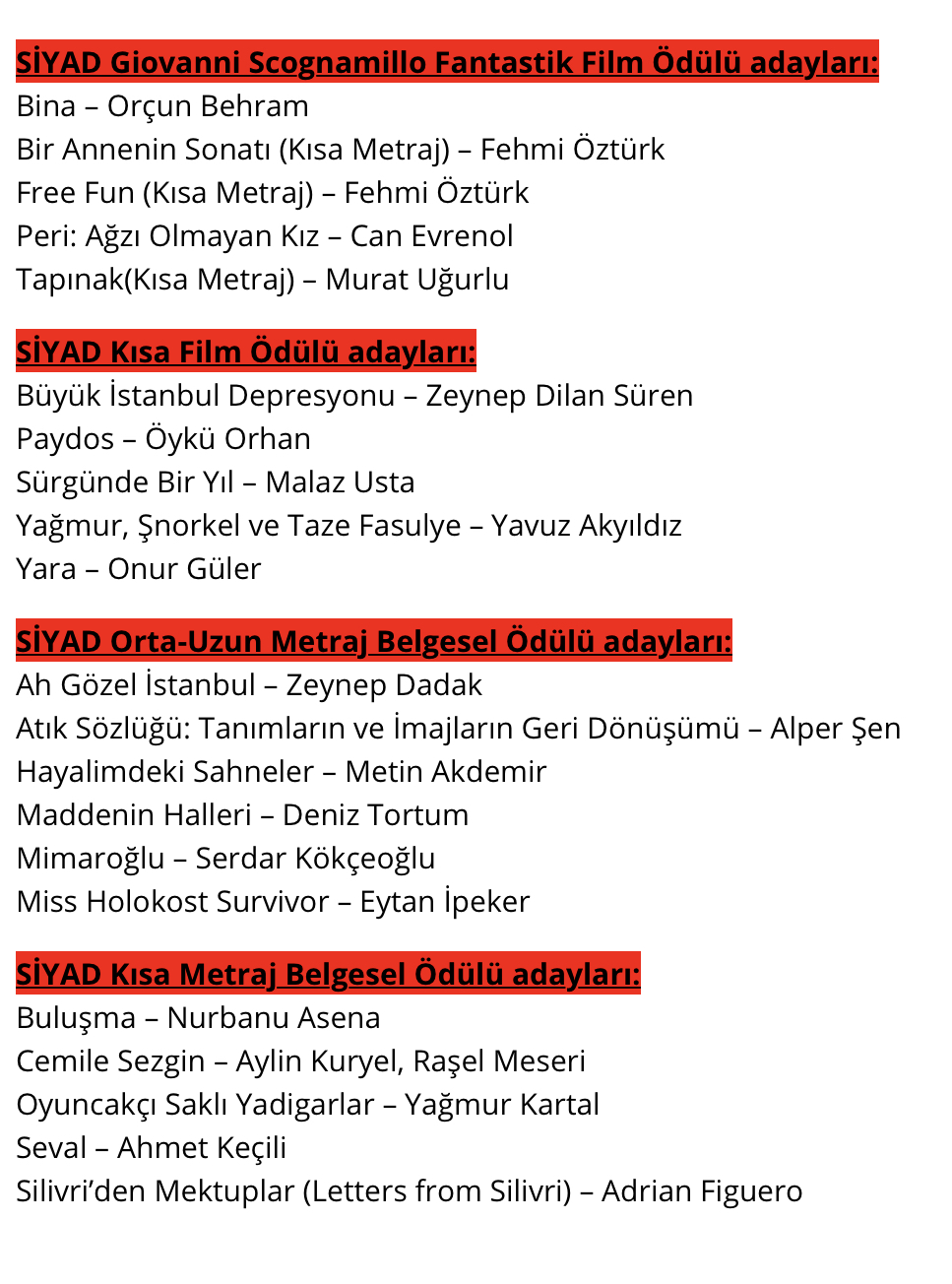 53. Sinema Yazarları Derneği (SİYAD)Türkiye Sineması Ödülleri’nin kısa film, belgesel ve fantastik film dallarındaki adayları da belli oldu. Toplam 16 kategoride SİYAD üyelerinin oylarıyla belirlenecek olan Türk sinemasının en iyileri, mart ayında gerçekleştirilecek törende açıklanacak.