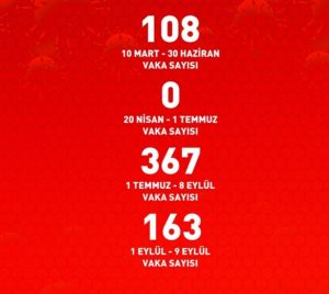 KKTC’de sadece Eylül ayının ilk 6 gününde tespit edilen vaka sayısı 1 Temmuz Açılımı öncesi ülkede görülen toplam vaka sayısını geçti. 1 Temmuz öncesi toplam 108 vaka tespit edilirken  Eylül ayının ilk 7 gününde bu rakam aşıldı. 1Eylül – 8 Eylül tarihleri arasında 8 günlük periyotta 144 vaka tespit edildi.
