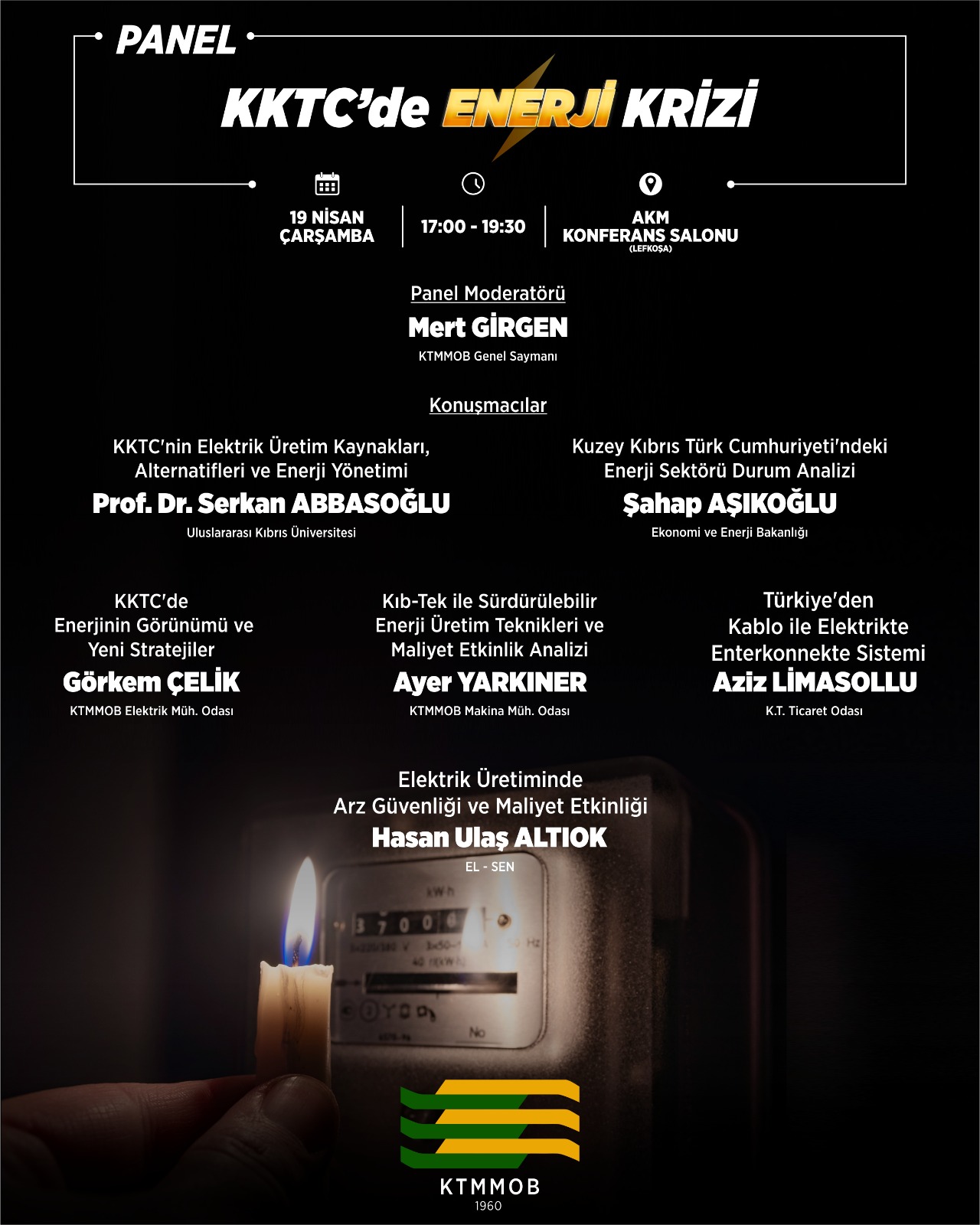 Halka açık yapılacak panelin moderatörlüğünü KTMMOB Genel Saymanı Mert Girgen üstelenecek. Panelin konuşmacıları ise Prof. Dr. Serkan Abbasoğlu (Uluslararası Kıbrıs Üniversitesi), Şahap Aşıkoğlu (Ekonomi ve Enerji Bakanlığı), Görkem Çelik (KTMMOB Elektrik Mühendisleri Odası), Ayer Yarkıner (KTMMOB Makina Mühendisleri Odası), Aziz Limasollu (K.T. Ticaret Odası), Hasan Ulaş Altıok (K.T. Elektrik Kurumu Çalışanları Sendikası) olacak.