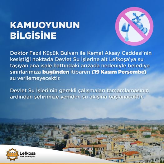 Doktor Fazıl Küçük Bulvarı ile Kemal Aksay Caddesi’nin kesiştiği noktada Devlet Su İşlerine ait Lefkoşa’ya su taşıyan ana isale hattındaki arızada nedeniyle belediye sınırlarımıza bugünden itibaren (19 Kasım Perşembe) su verilemeyecektir. Devlet Su İşleri’nin gerekli çalışmaları tamamlamasının ardından şehrimize yeniden su akışına başlanacaktır.”