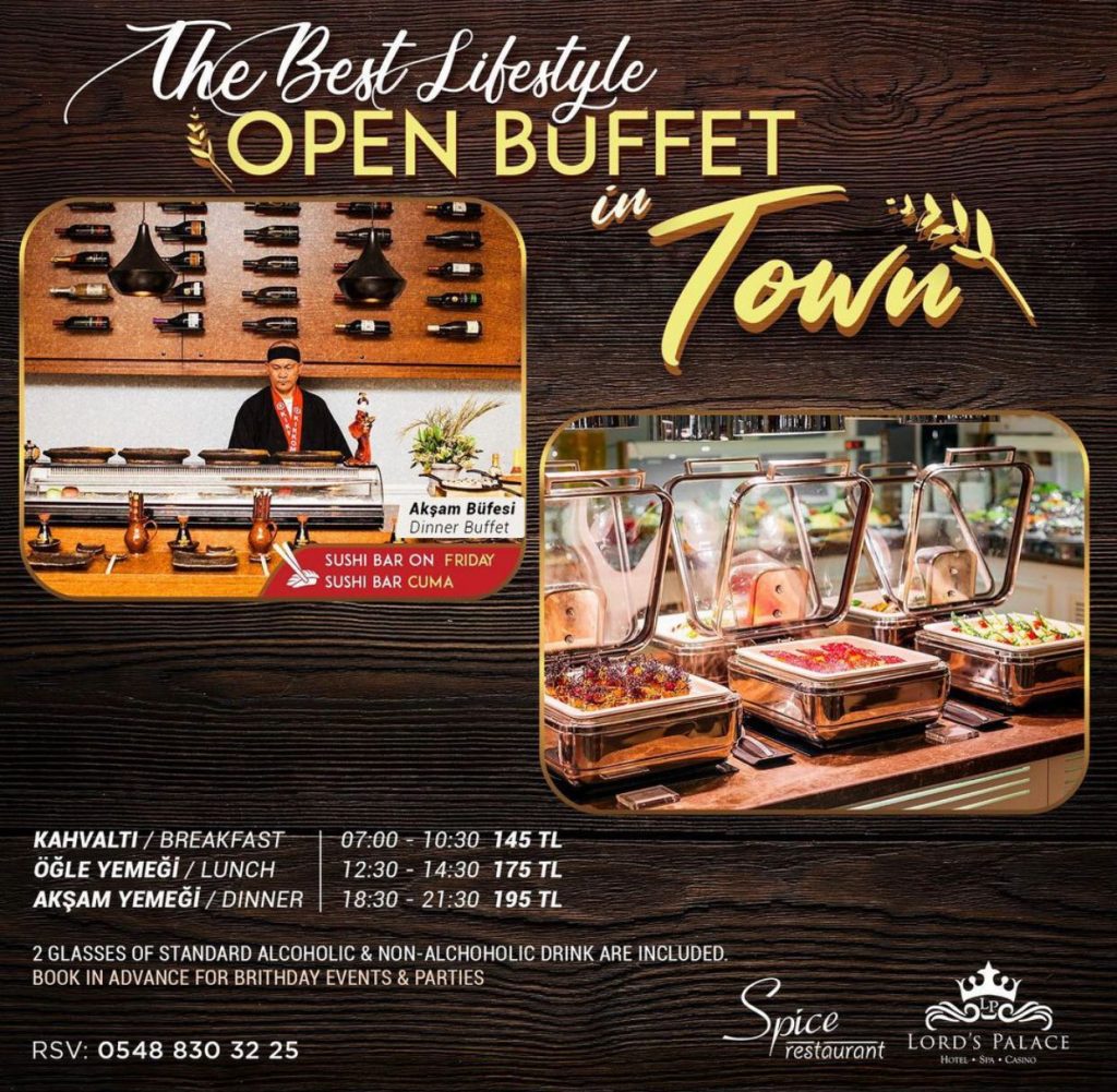 Ada’da tek lifestyle açık büfe Kahvaltı 07:00 – 10:30 Öğle yemeği 12:30- 14:30 ve Akşam yemeği 18:30 – 21:30 saatleri arasında uluslararası lezzetleri ile Lord’s Palace Hotel, Spice Restoranda! Ayrıntılı bilgi ve rezervasyon için; 0548 830 3225