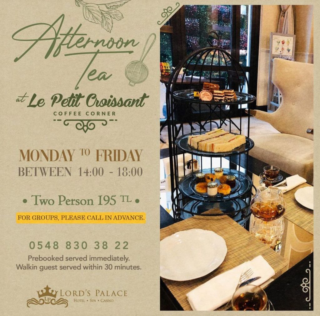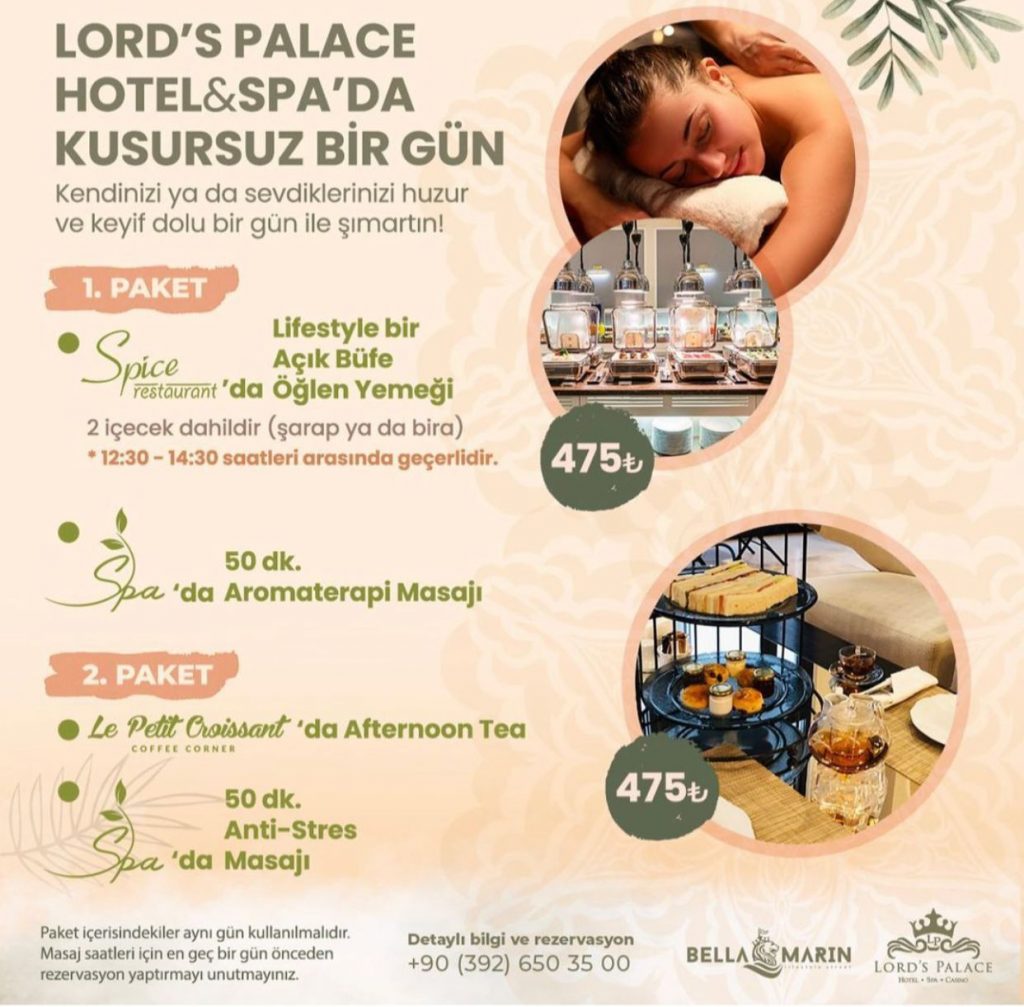 A PERFECT DAY PACKAGE 1 (per person 475 TL) *A Lifestyle Open Buffet Lunch @ Spice restaurant Including 2 drinks (beer or wine) * Between 12:30 – 14:30 *50 mins. Aromatherapy Massage @ spa Package 2 (per person 475 TL) *Afternoon tea @ le petit croissant coffee Corner *50 mins. Anti-Stress Massage @ Spa www.lordspalace.com