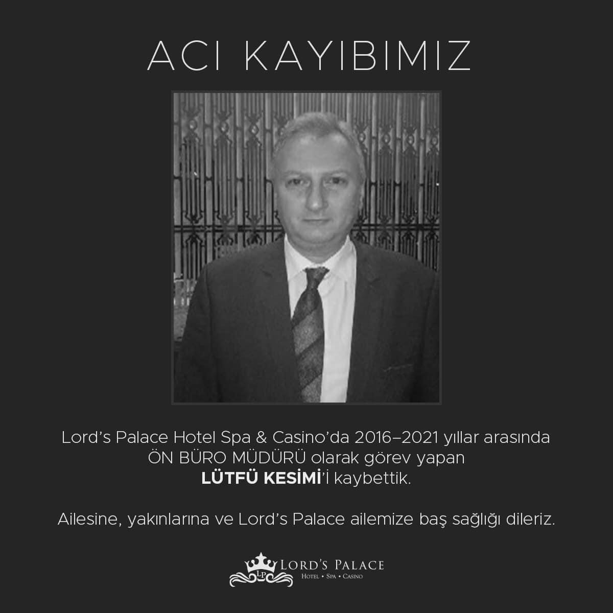 Lord’s Palace Hotel Spa & Casino’da 2016-2021 yıllar arasında ÖN BÜRO MÜDÜRÜ olarak görev yapan LÜTFÜ KESİMİ’i kaybettik. Ailesine, yakınlarına ve Lord’s Palace ailemize baş sağlığı dileriz.