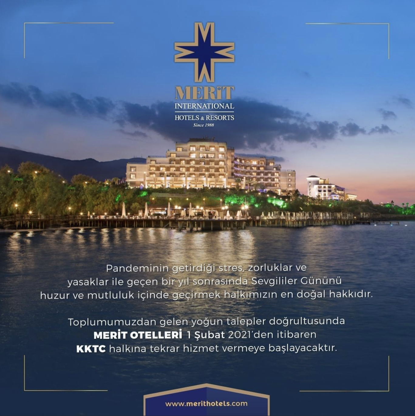 Toplumumuzdan gelen yoğun talepler doğrultusunda Merit Otelleri 1 Şubat 2021den itibaren KKTC halkına tekrar hizmet vermeye başlayacaktır.’