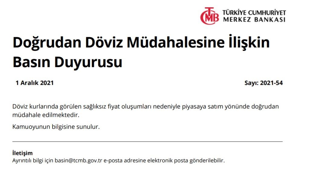 Merkez Bankası (TCMB) bugün yaptığı “Doğrudan Döviz Müdahalesine İlişkin Basın Duyurusu” başlıklı açıklamayla kura doğrudan müdahale ettiğini açıkladı.