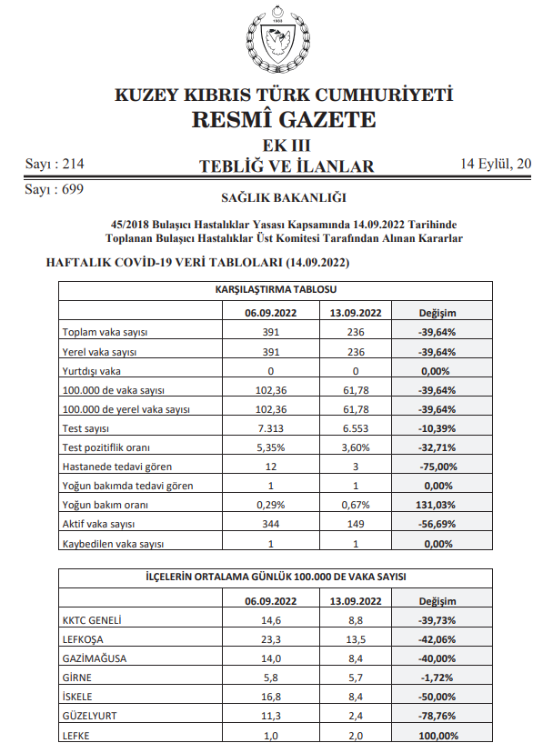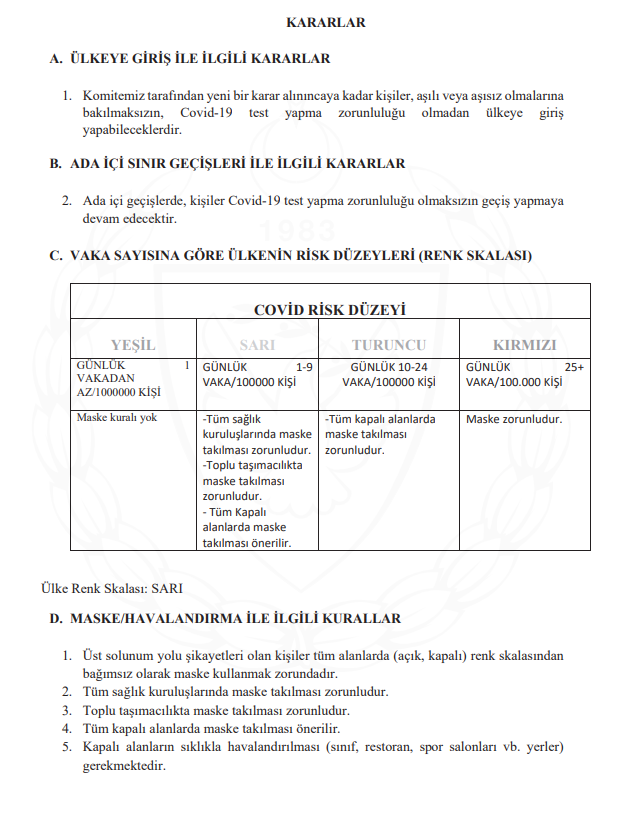 Bulaşıcı Hastalıklar Üst Komitesi’nin yeni kararları Resmi Gazete’de yayımlandı. Ülkenin koronavirüs vaka sayısına göre renk skalasının sarı olduğu açıklandı. Kararda, renk skalasının sarı olması nedeniyle maske ve havalandırma ile ilgili kurallarda güncelleme yapıldı.