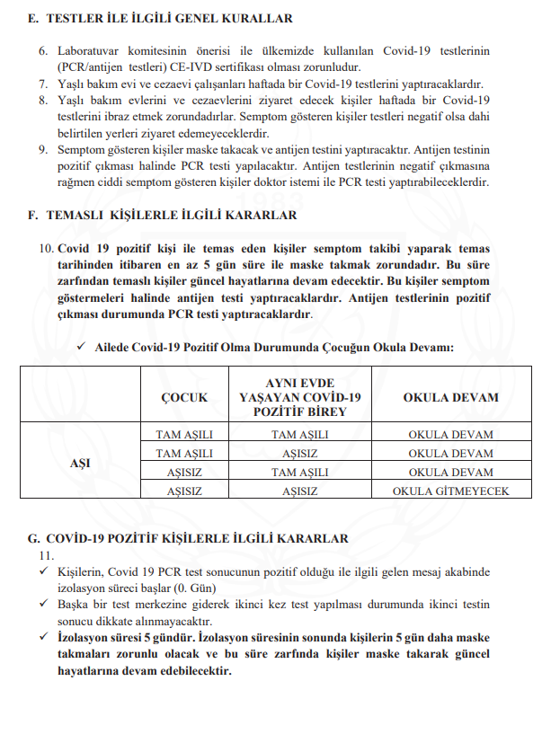 Bir sınıfta pozitif vaka görülmesi durumunda, vakanın görüldüğü tarihten itibaren sınıfta bulunan diğer kişiler 5 gün süre ile maske takarak okula gitmeye devam edecek. Bu süre içerisinde semptom gösteren kişiler test yaptırmaya yönlendirilecek.