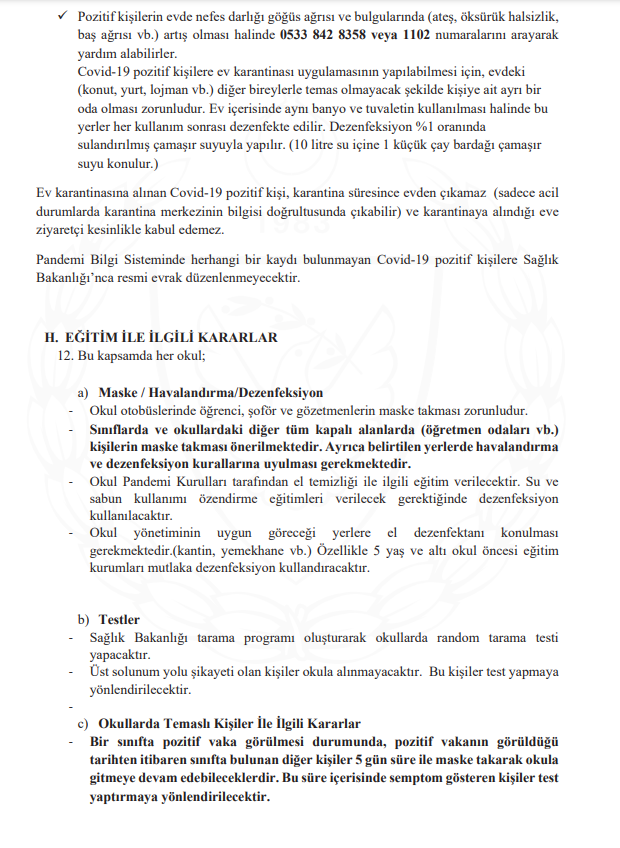 Bulaşıcı Hastalıklar Üst Komitesi’nin aldığı yeni kararlarına göre, okul otobüslerinde öğrenci, şoför ve gözetmenlerin maske takması zorunlu hale getirildi, sınıflarda ve okulların diğer tüm kapalı alanlarında kişilerin maske takması önerildi.