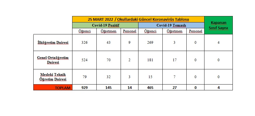 Eğitim Bakanlığı, 19 Mart-25 Mart tarihleri arasında 929 öğrenci, 145 öğretmen, 14 personelin COVID-19 testlerinin pozitif çıktığını açıkladı.