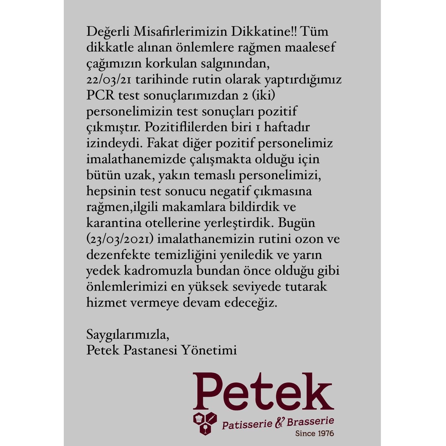 22/03/21 tarihinde rutin olarak yaptırdığımız PCR test sonuçlarımızdan 2 (iki) personelimizin test sonuçları pozitif çıkmıştır. Pozitiflilerden biri 1 haftadır izindeydi. Fakat diğer pozitif personelimiz imalathanemizde çalışmakta olduğu için bütün uzak, yakın temaslı personelimizi, hepsinin test sonucu negatif çıkmasına rağmen,ilgili makamlara bildirdik ve karantina otellerine yerleştirdik. Bugün (23/03/2021) imalathanemizin rutini ozon ve dezenfekte temizliğini yeniledik ve yarın yedek kadromuzla bundan önce olduğu gibi önlemlerimizi en yüksek seviyede tutarak hizmet vermeye devam edeceğiz.