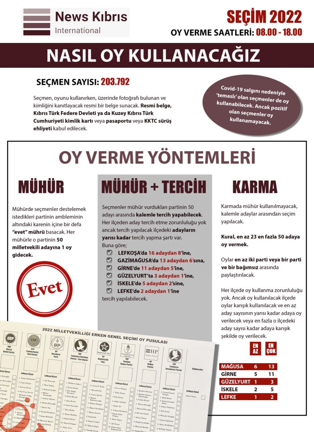 203 bin 792 seçmenin ilçelere göre dağılımı ise, Lefkoşa’da 65 bin 428, Gazimağusa’da 51 bin 149, Girne’de 44 bin 684, Güzelyurt’ta 15 bin 42, İskele’de 20 bin 550, Lefke’de 6 bin 639 şeklinde.