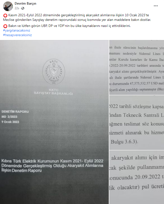 Sayıştay Başkanlığı’nın Kıbrıs Türk Elektrik Kurumu’nun (KIB-TEK) Kasım 2021 – Eylül 2022 tarihleri arasında gerçekleştirdiği akaryakıt alımlarına ilişkin denetim raporu ortaya çıktı.