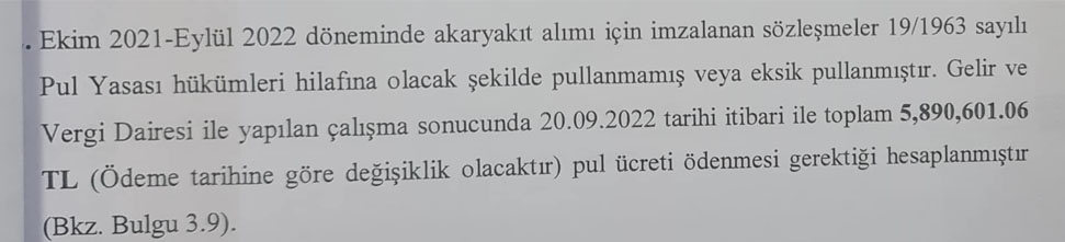 Ayrıyeten raporda, Ekim 2021-Eylül 2022 döneminde imzalanan sözleşmelerin Pul Yasası’na uygun pullanmadığı ve eksik pullandığı belirtiliyor. Bu sebepten ötürü de 5 milyon 890 bin 601 TL 90 kuruş pul ücreti ödenmesi gerektiği de tespit edildi.