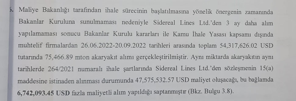 Yine rapora göre, Maliye Bakanlığı tarafından ihale sürecinin başlatılmasına yönelik önergenin zamanında Bakanlar Kurulu’na sunulmaması nedeniyle farklı firmalardan 26 Haziran – 20 Eylül 2022 tarihleri arasında, kamu ihale yasasına aykırı şekilde toplam 54 milyon 317 bin 626 dolar tutarında yakıt alındığı ifade edildi.