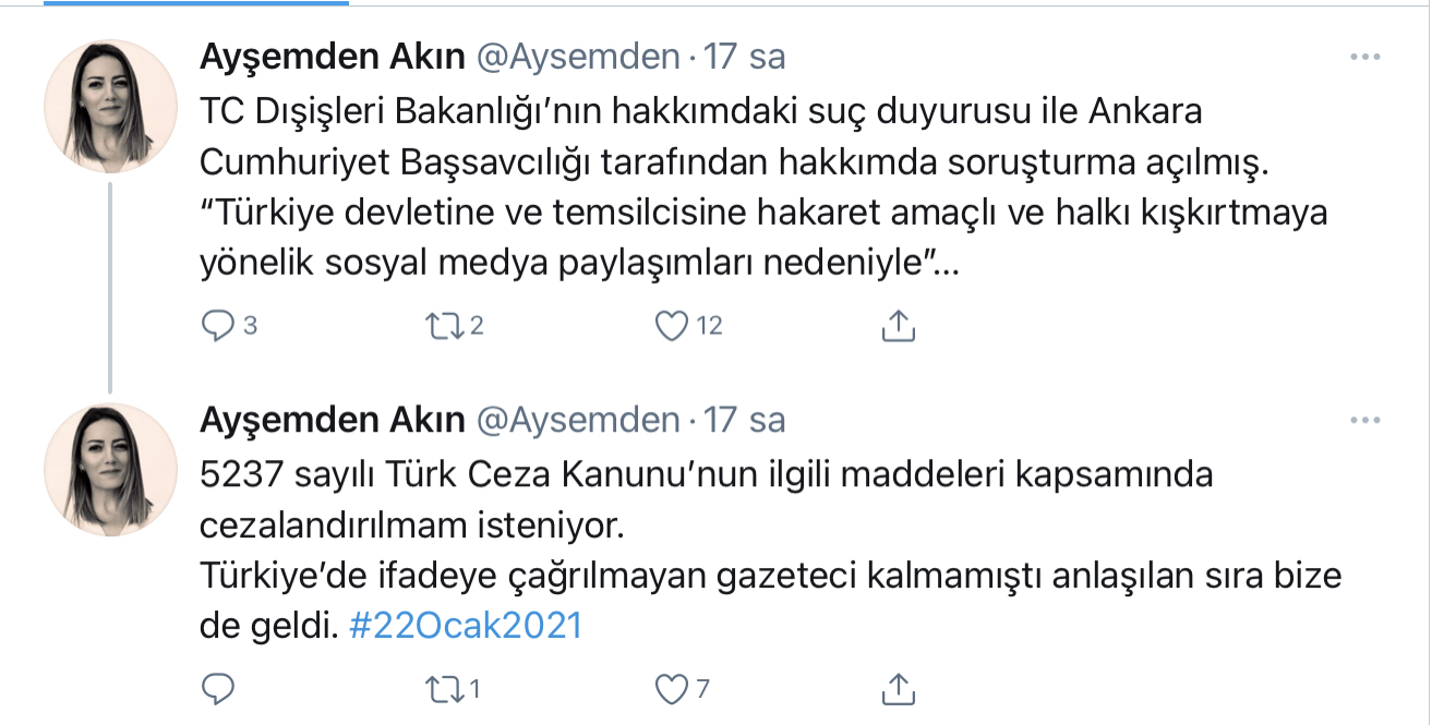 Yaptığı sosyal medya paylaşımları gerekçe gösterilerek gazeteci Ayşemden Akın’a Türkiye Cumhuriyeti tarafından soruşturma başlatıldı.