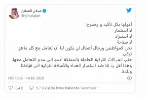 Hatta krallıkta çalışan Türk şirketleriyle bile çalışmama çağrısı yapıyorum. Bu da liderliğimize ve ülkemize karşı devam eden Türk düşmanlığı ve hakaretine karşı vereceğimiz en küçük yanıt.”