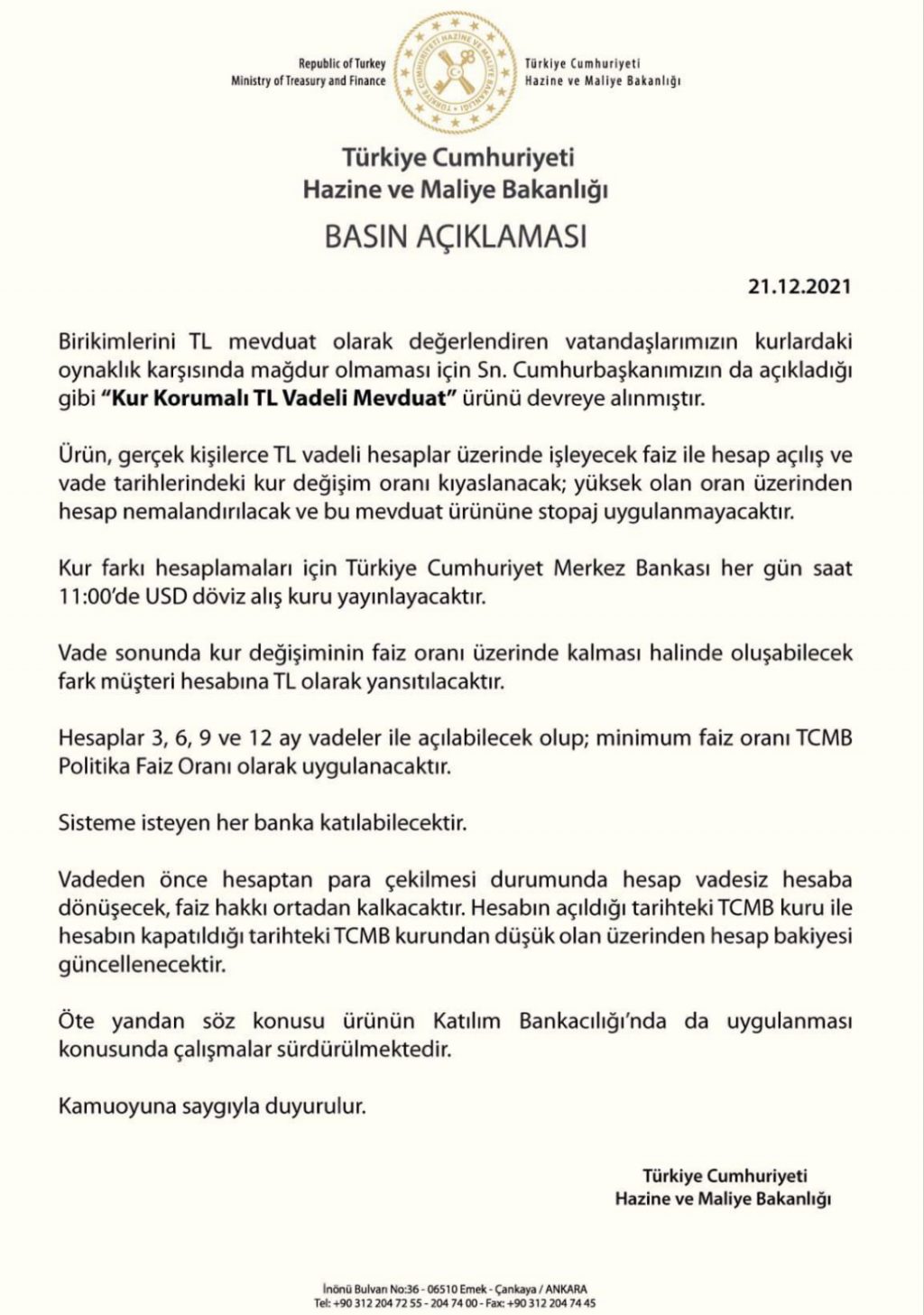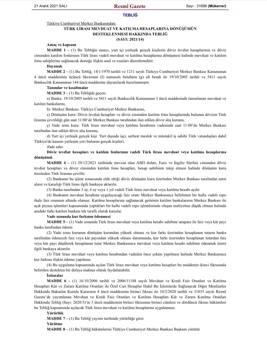 “Türkiye Cumhuriyet Merkez Bankası, döviz tevdiat hesaplarının ve döviz cinsinden katılım fonlarının hesap sahibinin talebi üzerine Türk lirası vadeli hesaplara dönüşmesi halinde mevduat ve katılım fonu sahiplerine destek sağlanmasına karar vermiştir. Bankacılık sistemindeki toplam mevduat/katılım fonu içinde Türk lirasının payının artırılarak finansal istikrarın desteklenmesi amacıyla;