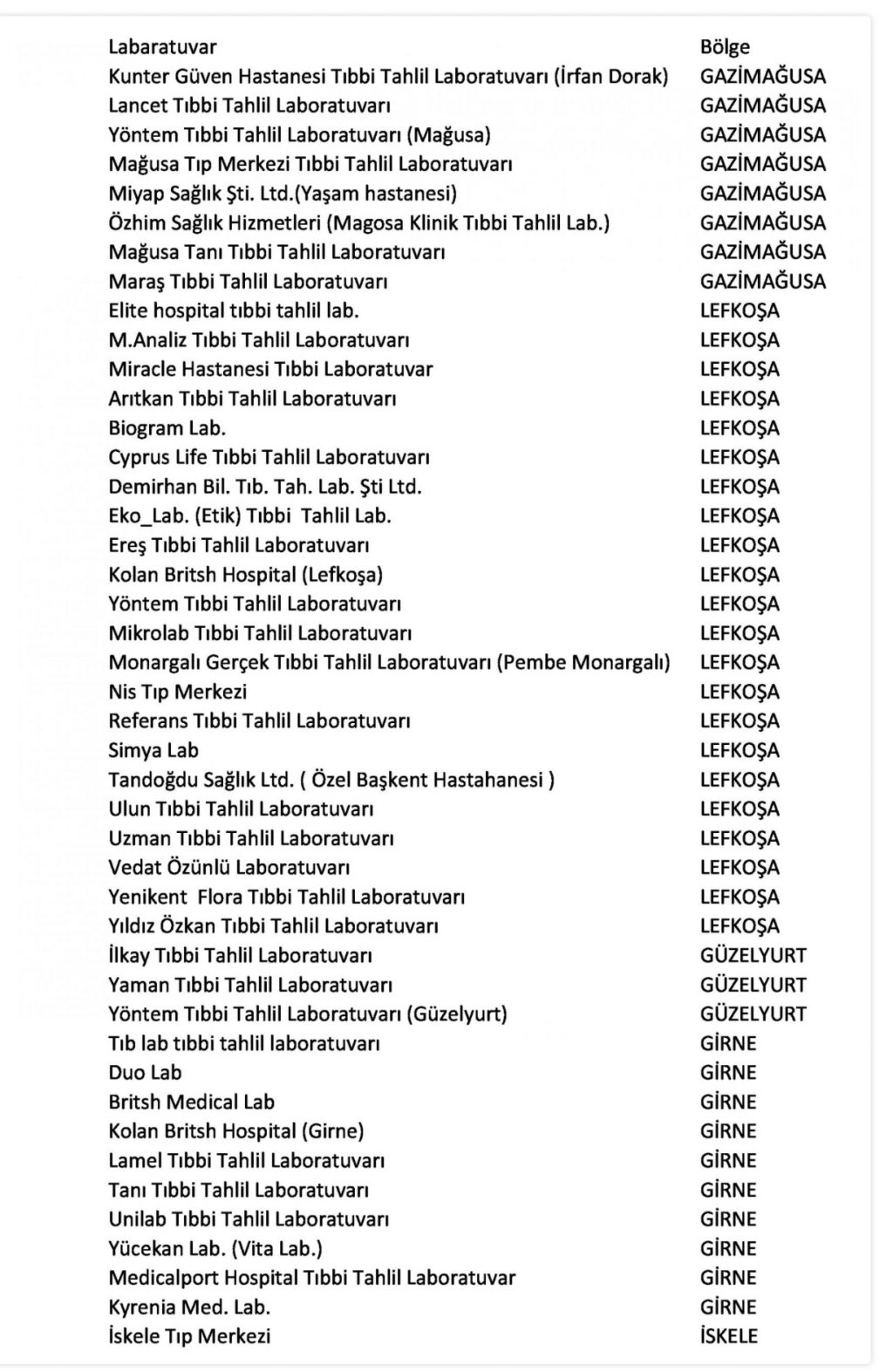 Bakanlığın anlaşmalı olduğu özel laboratuvarların listesi şöyle açıklandı: