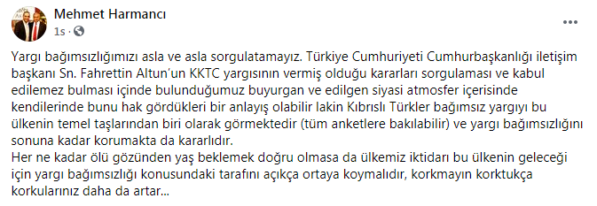 Harmancı, “KKTC yargısının vermiş olduğu kararları sorgulaması ve ‘kabul edilemez’ bulması, içinde bulunduğumuz buyurgan ve edilgen siyasi atmosfer içerisinde kendilerinde bunu hak gördükleri bir anlayış olabilir lakin Kıbrıslı Türkler bağımsız yargıyı bu ülkenin temel taşlarından biri olarak görmektedir. Yargı bağımsızlığını sonuna kadar korumakta da kararlıdır” ifadelerini kullandı.